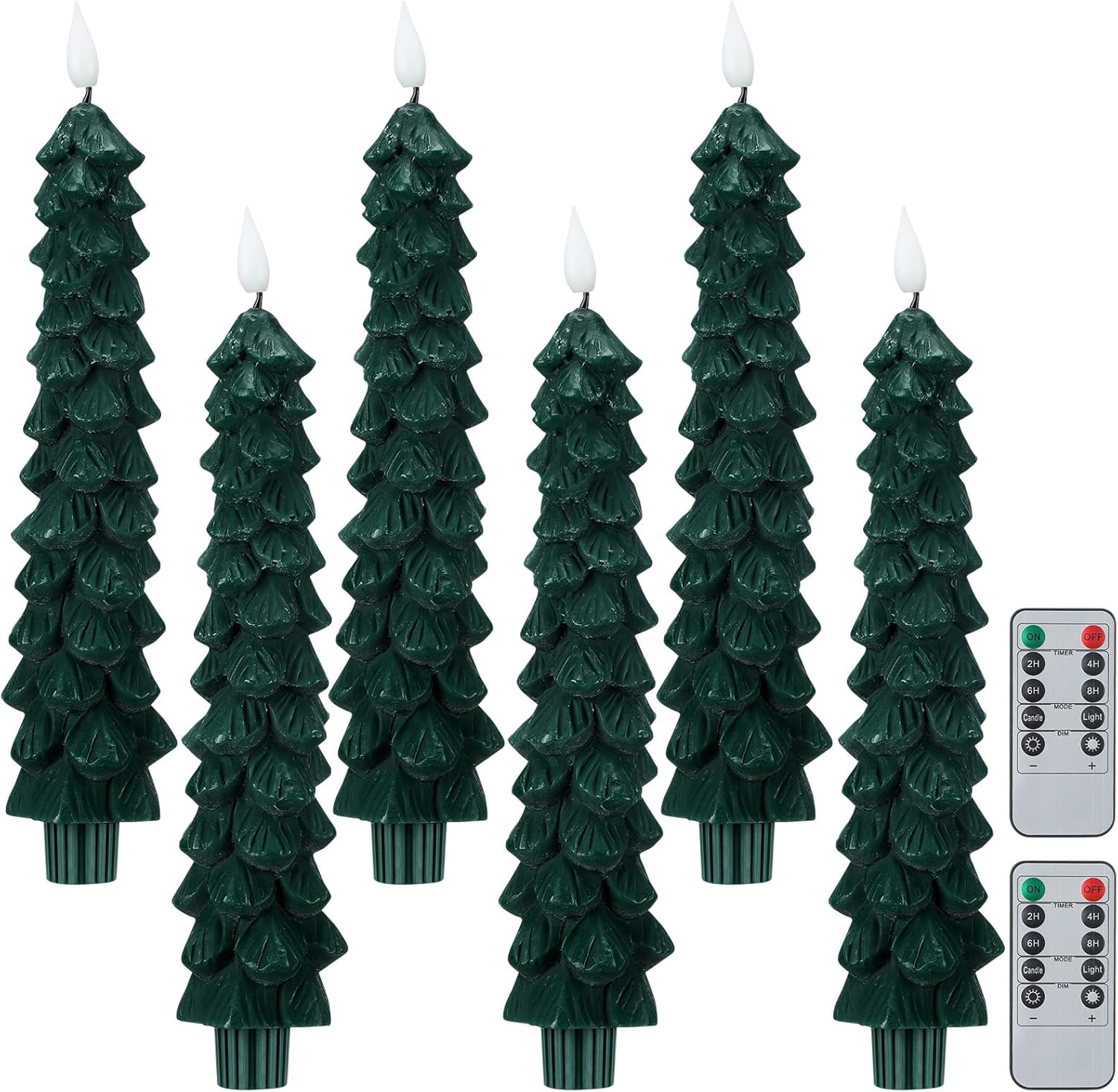 Each pack comes with 1/2/3/4/6 Flameless Christmas tree taper candles, the diameter is 0.8in, and the height is 10in. Each candle powered by 2*AAA batteries (Not included). 1 or 2 10-key remotes, 1 operating manual.